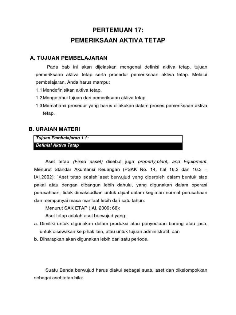 Penyusutan atau depresiasi adalah pengalokasian harga perolehan dari suatu aktiva tetap karena. Bila dibedakan dengan umur, maka aktiva tetap berwujud dapat digolongkan atas: 155) harga perolehan adalah harga beli ditambah seluruh biaya yang dikeluarkan untuk memperoleh dan menyiapkan hingga aktiva tetap tersebut siap digunakan. Misalnya tanah, dimana gedung atau kantor didirikan. Aktiva tetap (fixed asset) aktiva tetap adalah aktiva berwujud dan dalam bentuk siap pakai atau dibangun terlebih dahulu lalu digunakan dalam kegiatan operasi perusahaan. Hak cipta, hak paten, hak monopoli, biaya untuk riset, merek dagang, biaya untuk mendirikan. Jenis aktiva selain aktiva tetap aset atau aktiva yang merupakan kekayaan perusahaan menjadi sumber daya utama untuk melaksanakan kegiatan usaha. Aktiva tetap yang umumnya terbatas dan apabila sudah habis masa penggunaannya tidak dapat diganti dengan aktiva yang sejenis, misalnya sumbersumber alam seperti hasil tambang dan lainlain. Nominal atau nilai yang relatif signifikan dan jenis serta bentuk aktiva tetap yang cukup beragam membuat perusahaan harus lebih berhati hati dalam proses penggolongannya. Aktiva tetap tidak berwujud aktiva tidak berwujud (intangible assets) merupakan aktiva yang tidak memiliki wujud fisik, akan tetapi memiliki manfaat yang besar untuk perusahaan. Sehingga dalam akuntansi dikenal dengan penyusutan aktiva tetap. Contoh kertas kerja pemeriksaan aset tetap harus dibandingkan antara klien dan auditor. Untuk lebih jelasnya bisa rekan lihat pada tabel dibawah.